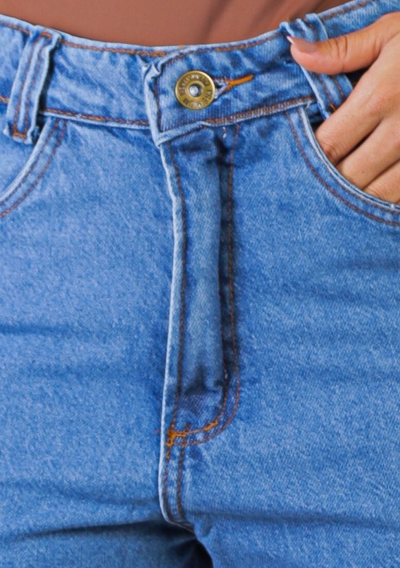 A lavagem jeans azul médio, uniforme e clássica, reforça o aspecto atemporal da peça e permite combinações com qualquer estilo de blusa, tênis, sandália ou bota. A barra levemente ampla complementa o visual alongado, garantindo harmonia da cintura até o chão.